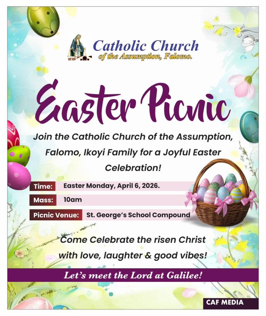 Let us celebrate Easter with joy, love, and togetherness—join us tomorrow at 10am for Mass and our Easter Picnic; come with your friends and family, and bring food to share as we enjoy a beautiful time of fellowship!