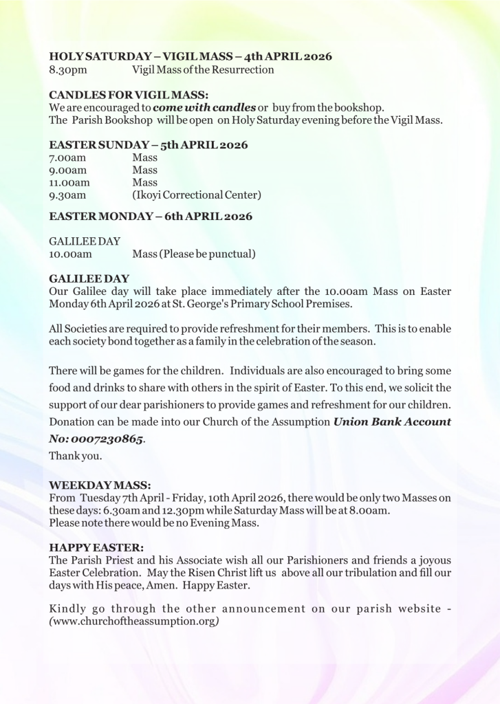 There will be games for the children. Individuals are also encouraged to bring some food and drinks to share with others in the spirit of Easter. To this end, we solicit the support of our dear parishioners to provide games and refreshment for our children. Donation can be made into our Church of the Assumption Union Bank Account No: 0007230865.