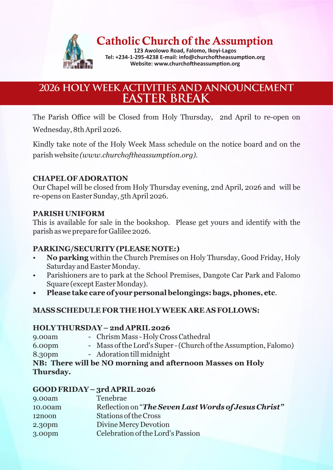From Tuesday 7th April – Friday, 10th April 2026, there would be only two Masses on these days: 6.30am and 12.30pm while Saturday Mass will be at 8.00am.