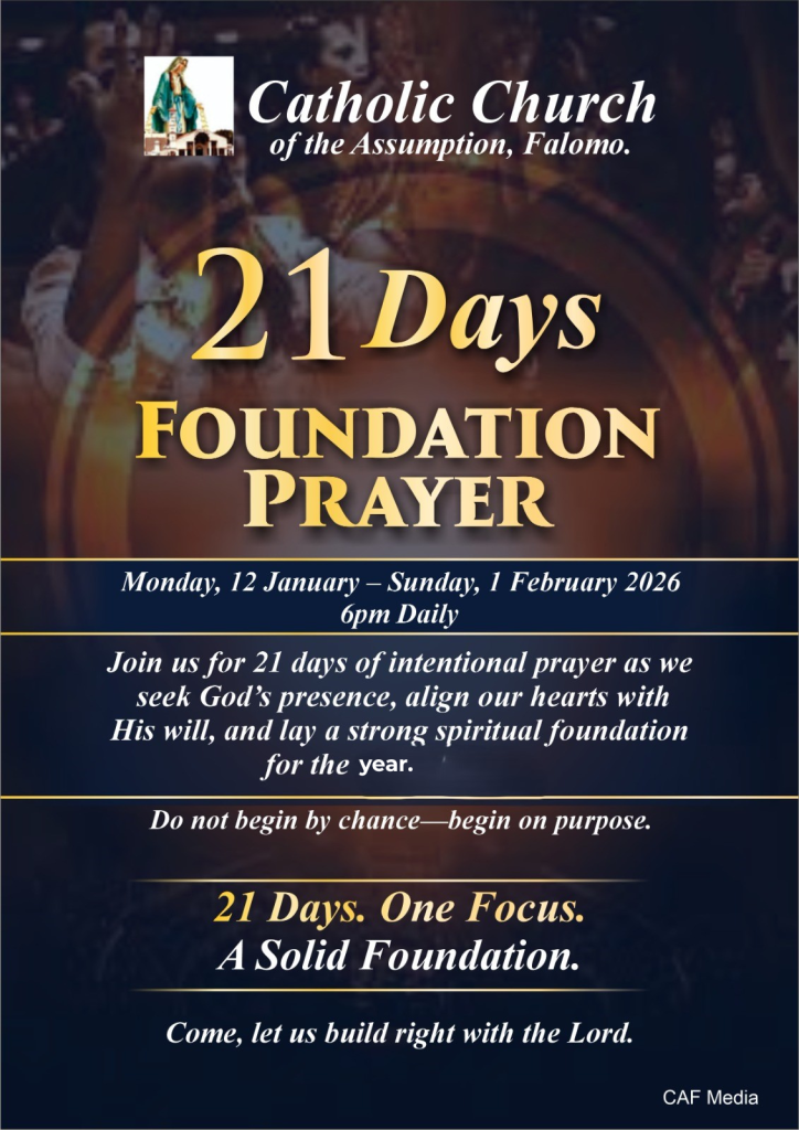 The Parish 21-Day New Year Retreat begins on Monday, 12th January, and will continue until Sunday, 1st February 2026. The retreat starts with the 6:00 pm Mass. Parishioners are encouraged to participate actively.